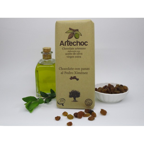 Nuestro chocolate negro y cremoso elaborado con aceite de oliva virgen extra y unas excelentes pasas rehidratadas con un vino Pedro Ximénez denominación de origen de sabor increíble, dan forma a esta tableta de chocolate. Desde Artechoc, es nuestro trabajo fusionar estos ingredientes de la máxima calidad con sabores nítidos, respetando cada uno de ellos, para que nuestros clientes los aprecien en cada bocado, provocando una experiencia única en su boca.